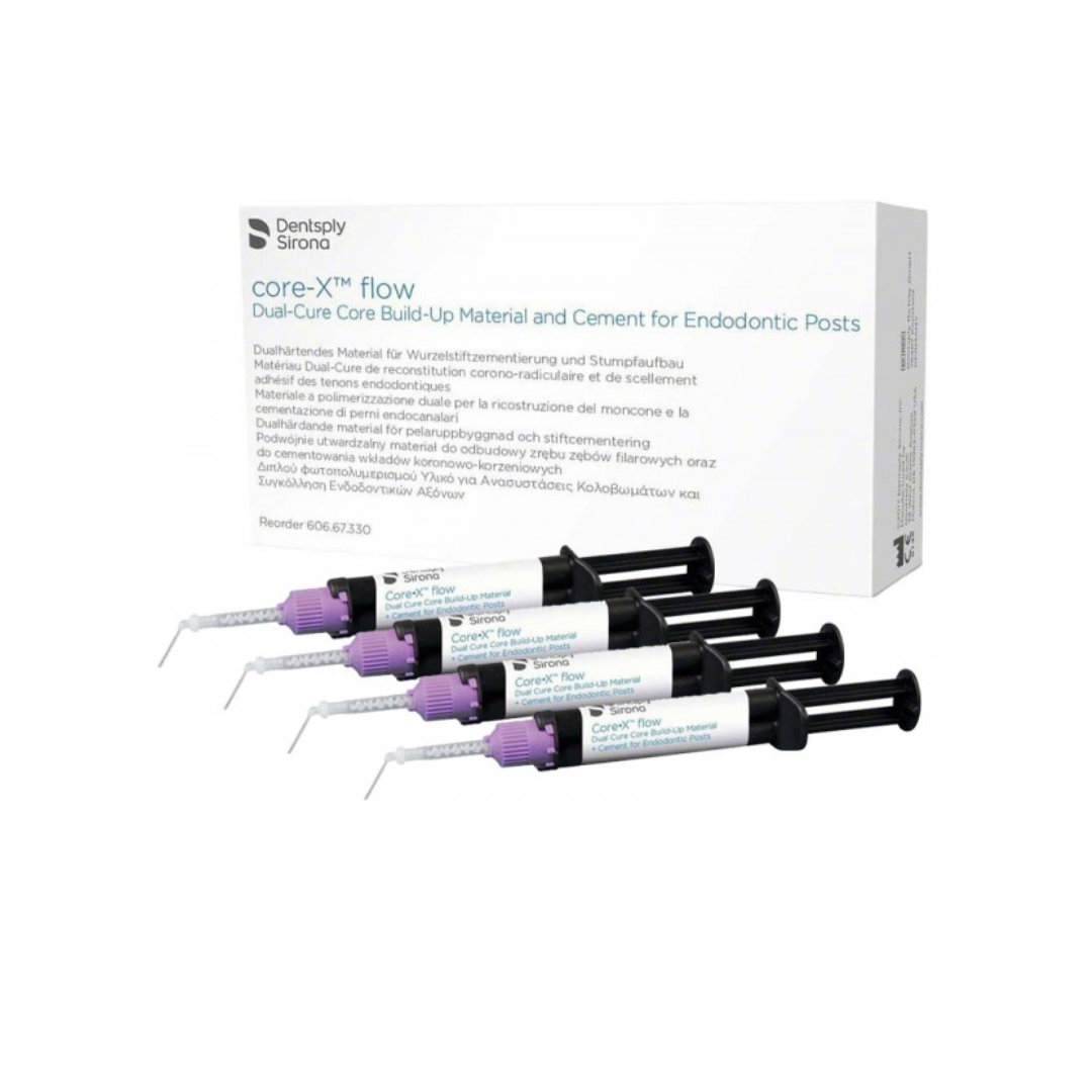 Core x-flow est une pâte de deux composants, une base et un catalyseur qui, une fois mélangés, forment une résine de composite de double polymérisation pour la cémentation et la reconstruction des moignons.